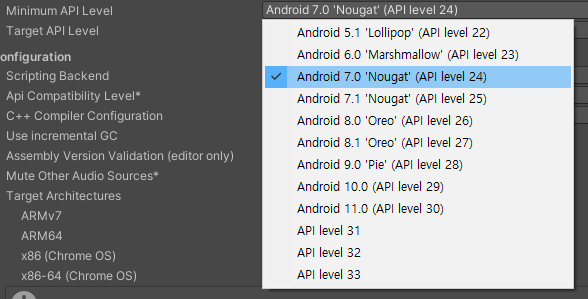 그 후, Minimum API Level을 Android 7.0(24)로 바꿔주면,