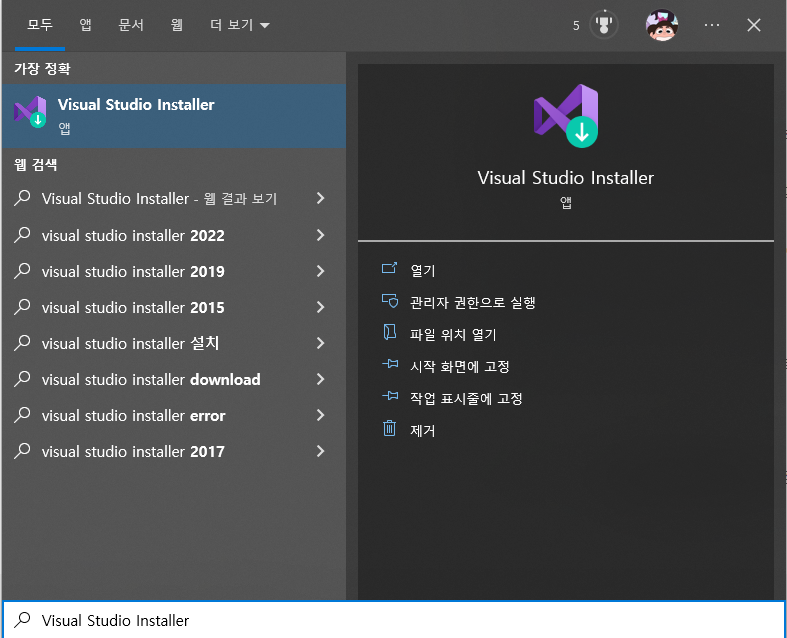 예상하다시피, Visual Studio Installer을 검색해준다.