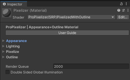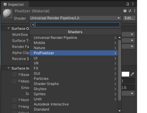 일단 Shader를 바꿔야 한다. [ProPixelizer] -> [SRP] -> [PixelizedWithOutline]을 선택해 준다.