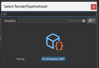 | 1. use the included ProPixelizer render pipeline asset, or 2. follow the instructions below to add ProPixelizer to your own Render Pipeline Asset |