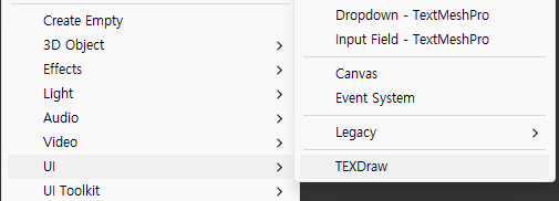 [UI] -> [TEXDraw]를 클릭해서 만들어줄 수 있다.
