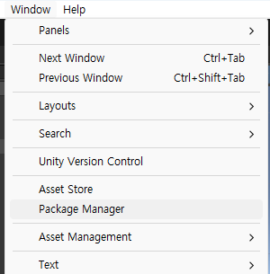 [Window] -> [Package Manager]로 들어가서 Package Manager 창을 연 다음