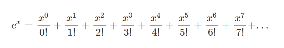 따라서 매우 비슷한 형태인 자연지수 함수, (e의 x승)을 테일러급수 전개하고,