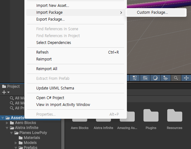 이걸 불러오려면 드래그&드롭을 하거나 [Assets] -> [Import Package] -> [Custom Package]를 눌러서
