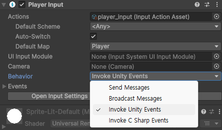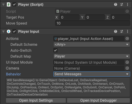 Player Input의 Behavior 세팅을 Send Messages에서 Invoke Unity Events로 바꿔주면