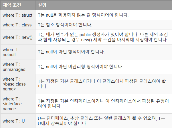 Where은 제약 조건이라고 불리며 제네릭의 본질인 "타입에 상관없는" 특성의 단점을 보완한다.
