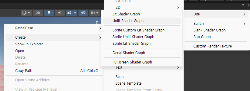 우선 Create메뉴에서 Unlit Shader Graph를 만들어주고 더블클릭해서 들어가 주자.