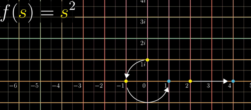 여기도 이해하기 어려웠다. 위 사진처럼 f(s) = s^2의 예시를 들어주고 f를 제타 함수로 바꿔서 표현해주는 과정을 거치는데, 일단 위 사진부터 이해하자면 s를 제곱하면 나오는 값으로 점을 이동시키는 경로를 그리면 아래와 같은 사진이 나온다는 말이다.