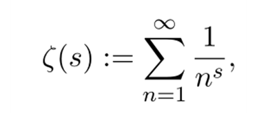 이것이 제타 함수이다. 안쪽의 정의역은 주로 s로 표시한다. :=이라는 기호는 정의할 때 사용한다고 한다. 아무튼, 자연수의 역수의 제곱의 무한 합과 같다. 고교 미적분 교과서의 무한급수와도 연관 지을 수 있어 보인다.