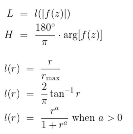 색상(H)와 명도(L)은 각각 다음과 같은 식을 통해 나타내어 진다고 한다. 이중에 모르는 말을 짚고 넘어가자면, arg[f(z)]에서의 arg, r_max 정도가 있을 것 같다. arg에 관한 정보는 최근 행렬을 배우고 싶다는 내 요청과 확률과 통계 선생님의 추천으로 구매한 “수학의 정석 – 행렬, 벡터, 복소평면”에서 확인할 수 있었다. [15]