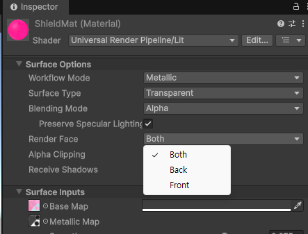 URP 프로젝트에서는, Material의 설정 옵션 중에 Render Face가 있는데,