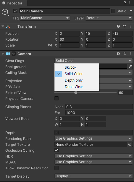 Main Camera 오브젝트의 Camera컴포넌트의