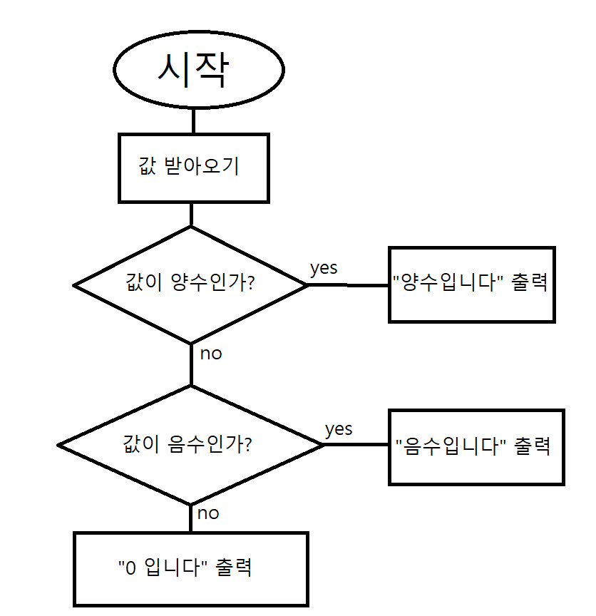 음수인지 양수인지 출력하는 순서도 그림으로