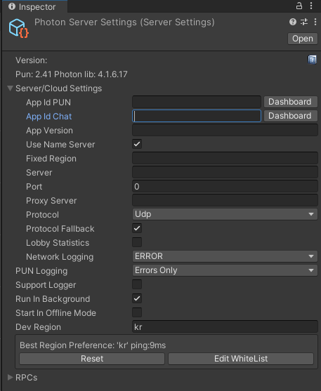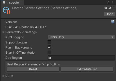 그럼 인스펙터에 저런 서버세팅 데이터가 표시되는데,