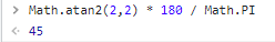F12를 눌러 콘솔에 Math.atan2(2,2) * 180 / Math.PI