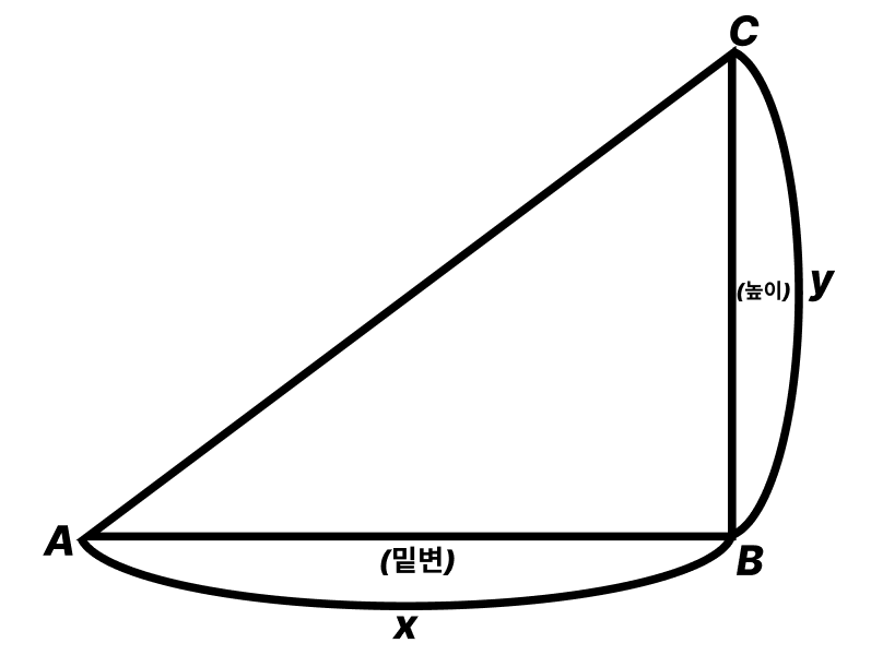 이 그림에서 선분의 길이를 각각 x, y로 두고 탄젠트 세타(0 비슷하게 생긴 거)를 물어본다면