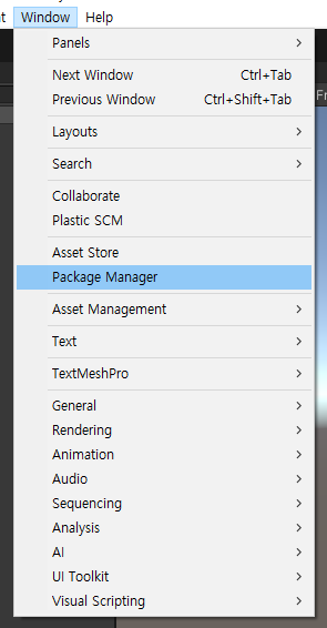 먼저, 언제나 그랬듯이 Window -> Package Manager로 들어가준다.