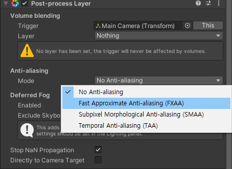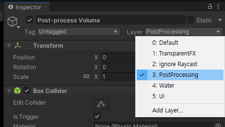 그후 Post-process Layer의 Layer이라는 항목을 PostProcessing으로 설정해준다.